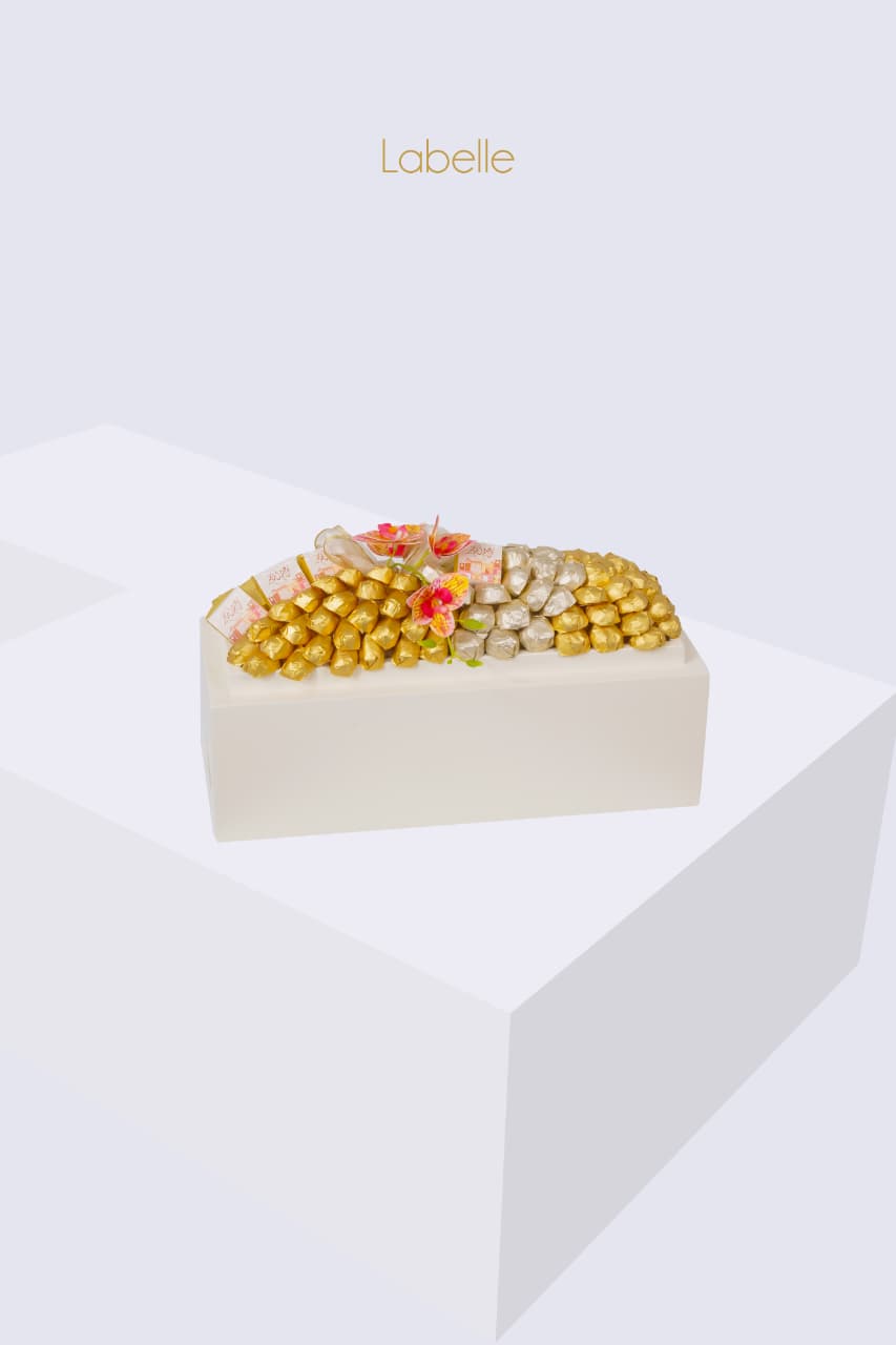 - Dual-tone arrangement: gold and silver-foiled premium Labelle chocolates